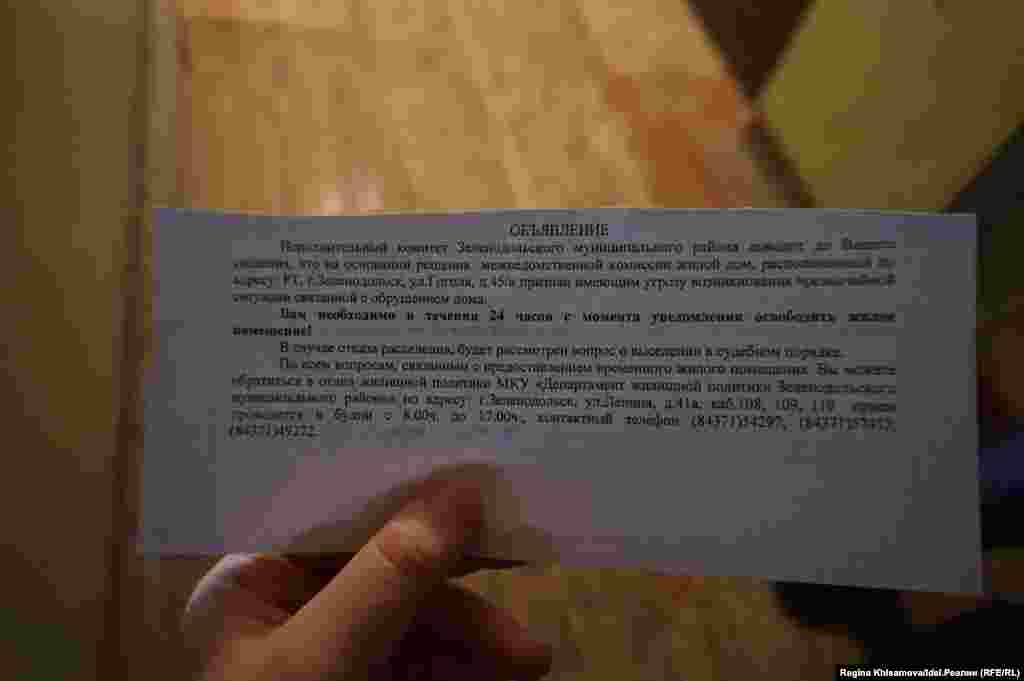 В прошлую пятницу в Зеленодольске обвалилась часть стены общежития по Гоголя, 45а. Жильцы первые забили тревогу, потом подключились местные власти. Они дали 24 часа на выселение из дома. Часть жильцов отказались покидать комнаты, их смущает, что администрация предоставляет временное жилье в санаториях, но только на одну неделю. Что делать потом и как жить дальше — никто не говорит. От администрации даже поступило предложение временно переехать с детьми в аварийные и уже расселенные квартиры. "Все временное может стать постоянным", — иронично ответили им власти. "Idel.Реалии" посетили не признанное аварийным общежитие и поговорили с жильцами.