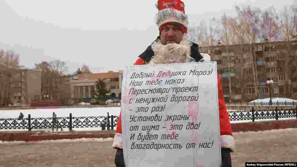 В последнее воскресенье уходящего 2019-го жители казанского микрорайона Танкодром вновь вышли на акцию протеста. На сей раз — в новогодних нарядах костюмах снегурочек и дедов морозов и мишурой, накинутой на плечи. Правда, настроение собравшихся было совсем не новогодним, в руках люди держали те же плакаты, что и два месяца назад — с просьбами не сносить их дома и чтить частную собственность.