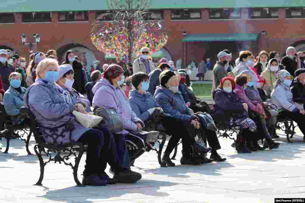 Организаторы "Пеледыш Пайрем" выдавали всем посетителям кремля одноразовые маски, обрабатывали руки входящих антисептиком. Вероятно, большая часть зрителей была в масках.