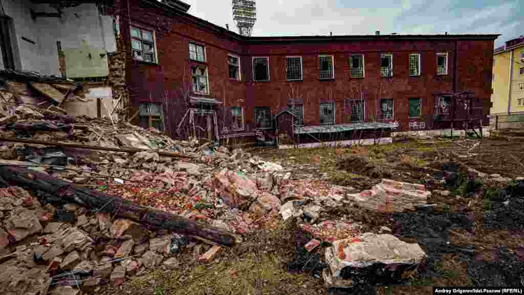 Журналисты "Idel.Реалии" успели побывать в здании в ночь накануне окончательного сноса — несмотря на то, что к тому моменту девелопер уже успел частично разрушить боковые стены, строение, официально объявленное "аварийным", по-прежнему крепко стояло на фундаменте. Общественники и краеведы всё еще надеялись, что компромисс будет найден и баню удастся сохранить.