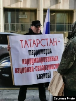 Евгений Ефремов стоял с плакатами "Татарстан — территория коррумпированных национал-сепаратистских кланов!" и "Ханы из Татарстана превращают Совет Федерации в криминальный отстойник".