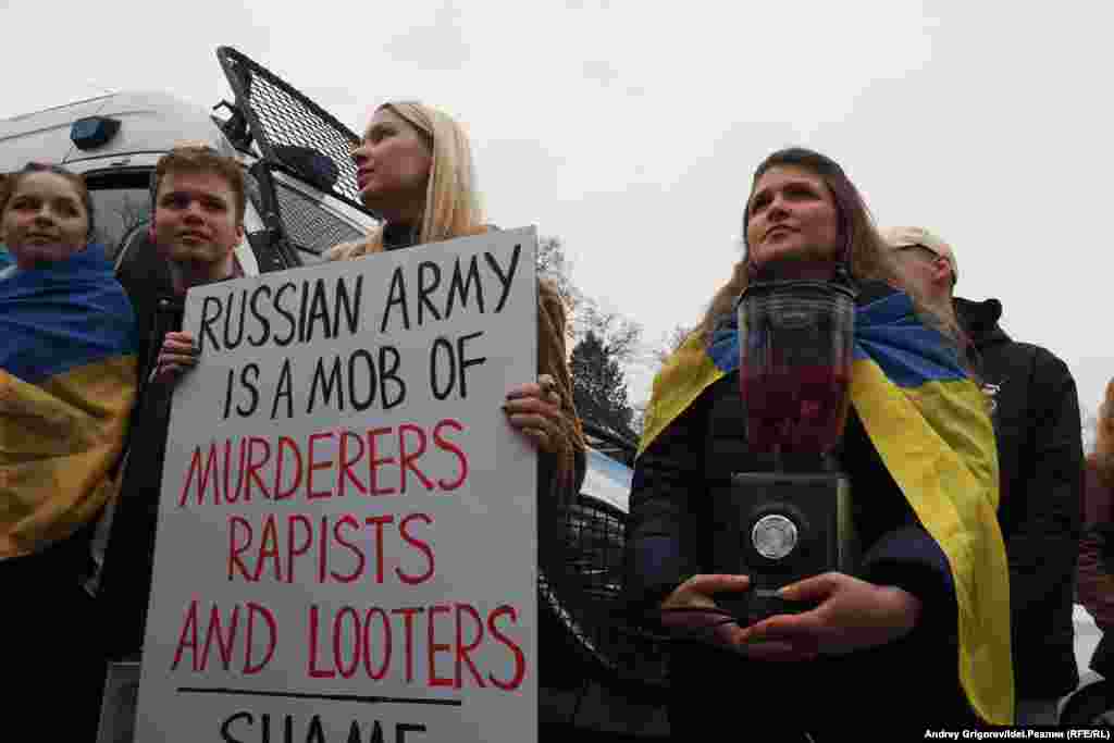 По завершении акции у российского посольства часть протестующих с зажженными свечами переместилась к посольству Украины.