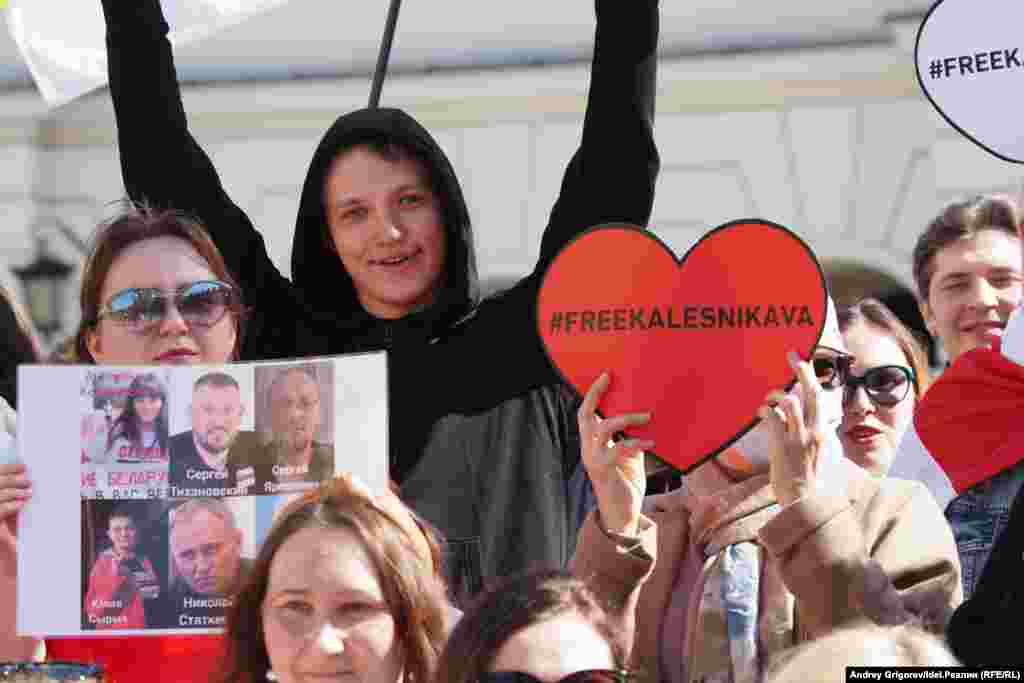 Участникам акции раздали сердечки с хештегом #freekalesnikava, эти сердечки люди во время митинга то и дело поднимали высоко над головами.