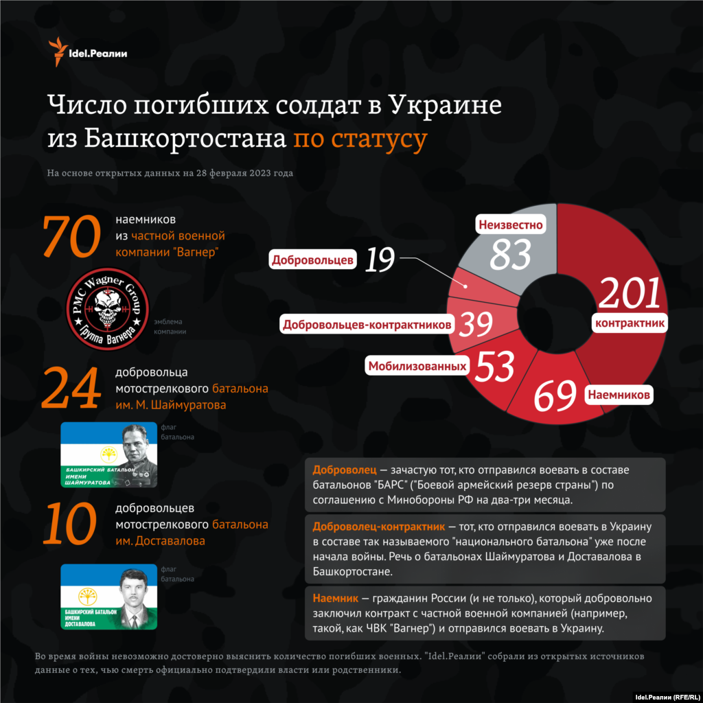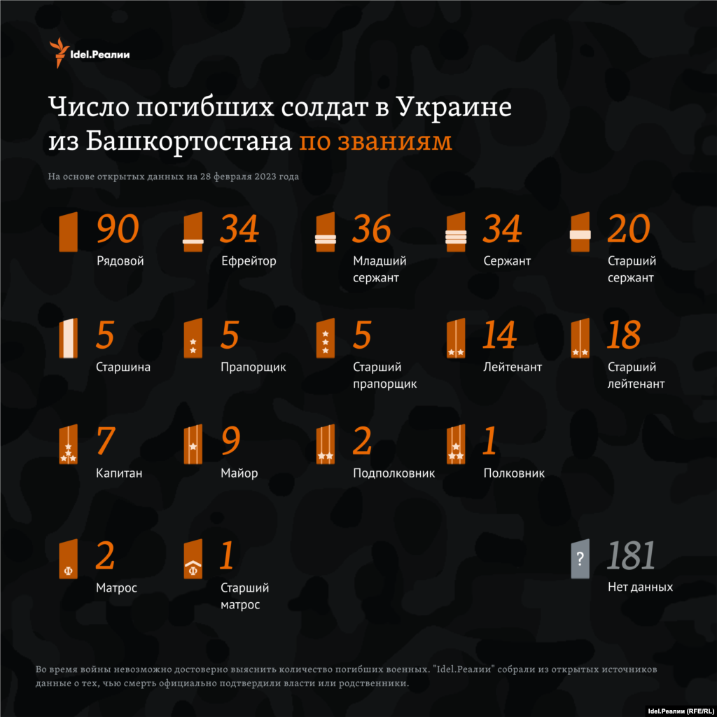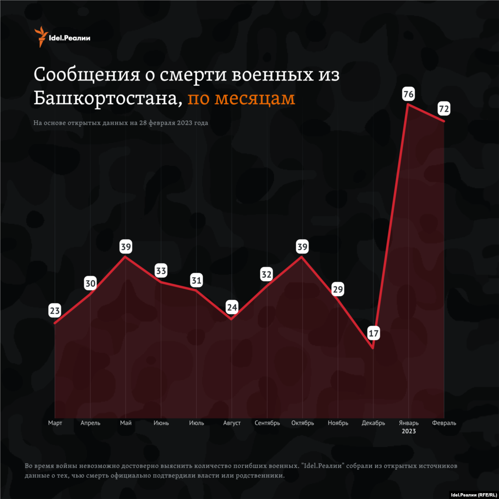 По подсчетам "Idel.Реалии" на конец февраля 2023 года на основе открытых данных, погибшими из Башкортостана на войне, которую Россия ведет в Украине, оказались 464 человека.