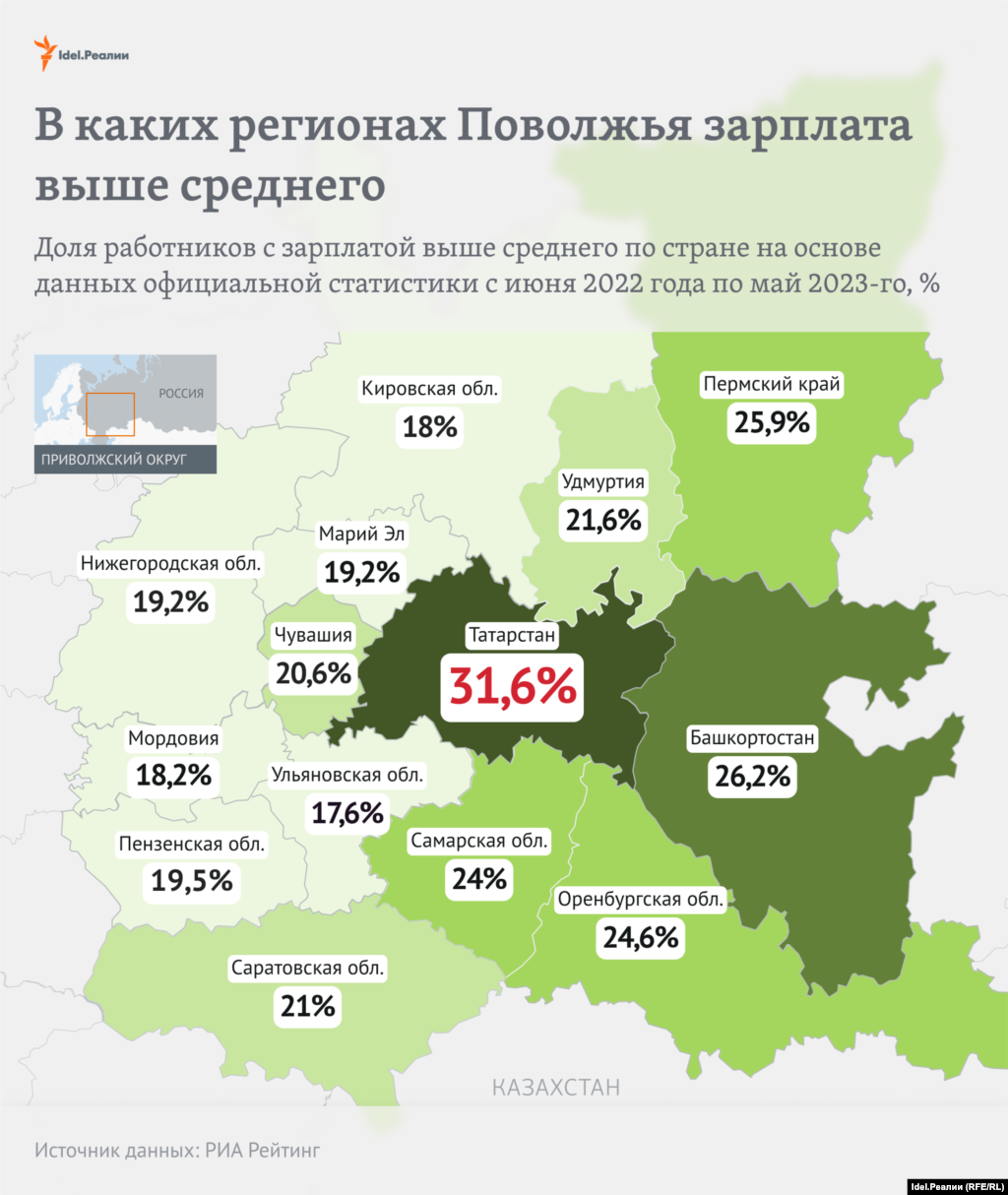 Лидерами рейтинга регионов Поволжья по доле специалистов с зарплатами выше среднего стали Татарстан (31,6%), Башкортостан (26,2%) и Пермский край (25,9%).
