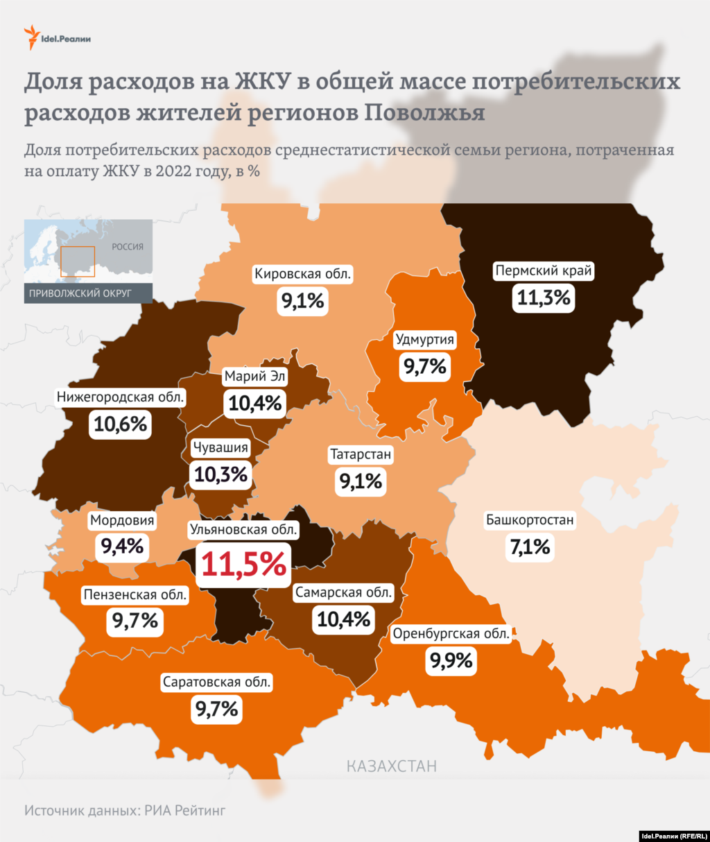 Что касается доли трат на "коммуналку" в потребительских расходах, то самая большая зафиксирована в семьях Ульяновской области — 11,5%. Хотя по тратам на ЖКУ регион находится примерно посредине — ульяновцы тратят в среднем по 4 159 рублей. Наименьшая доля затрат на коммунальные услуги отмечается в Башкортостане — 7,1% (3 704 рубля).