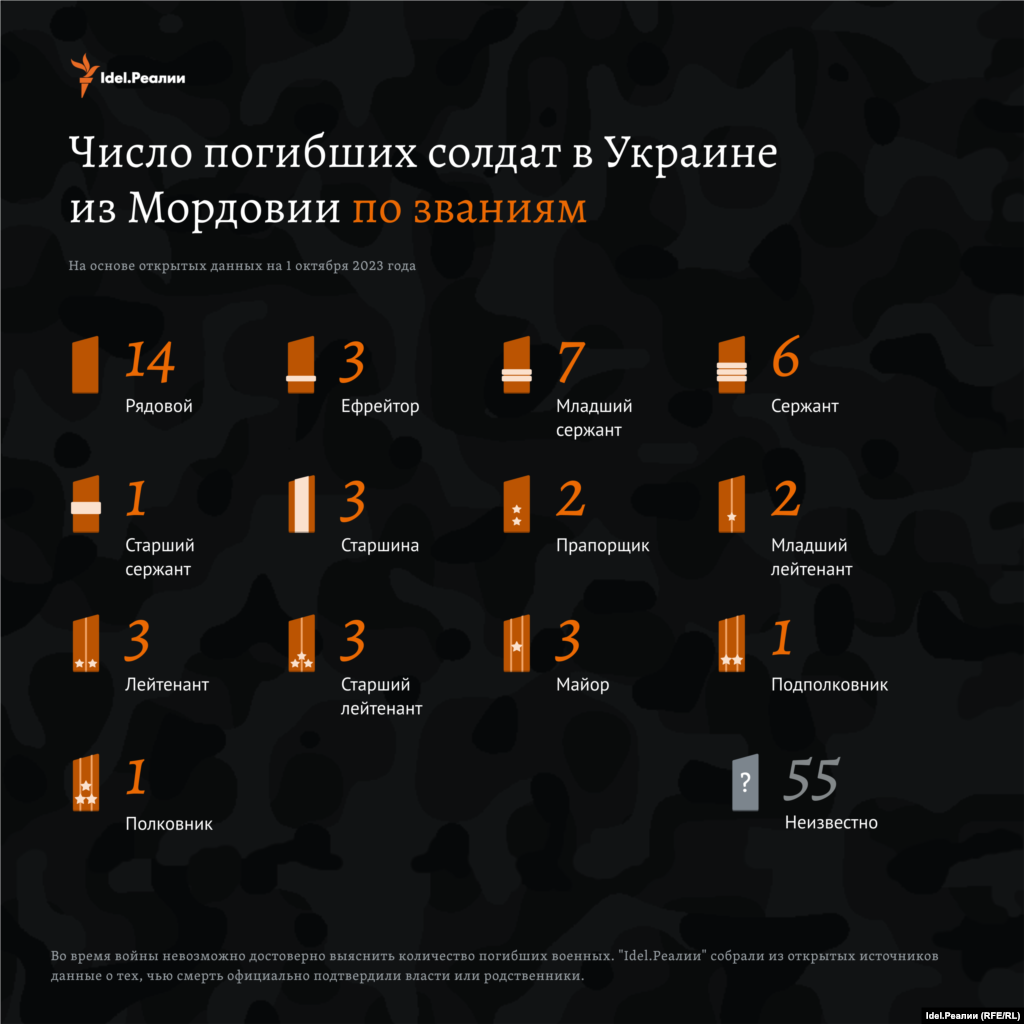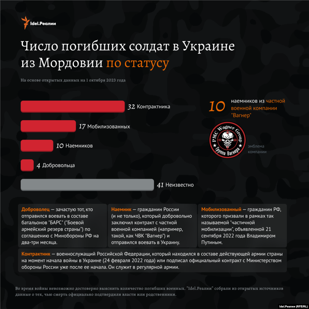 Из общего числа погибших 32 человека числились контрактниками — это те, кто находились в составе действующей армии страны на момент начала войны в Украине (24 февраля 2022 года) или подписали официальный контракт с Министерством обороны России уже после ее начала. Они служили в регулярной армии. Еще 10 человек были наемниками ЧВК "Вагнер"; 17 — мобилизованными; 4 — добровольцами.