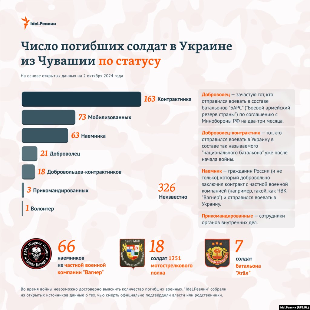 Из общего числа погибших как минимум 163 человека были контрактниками, 73 — мобилизованными, 63 — наемниками, 21 — добровольцем. Как минимум 7 человек служили в национальном батальоне "Атал".