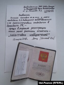 САМАРА. УИК №2910 в школе №81. Онкобольной Владимир Логинов публично отказался участвовать в голосовании на выборах президента РФ. Так мужчина выразил протест о снятии с участия в выборах оппозиционного кандидата Алексея Навального. Логинов передал заявление на имя председателя УИКа Ольге Милашкиной, потребовав, чтобы в журнале для голосования записали: "Логинов-забастовка избирателей". Милашкина пообещала передать заявление в облизбирком.
