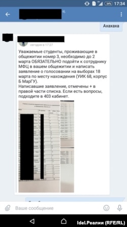 МАРИЙ ЭЛ. Местный штаб Алексея Навального опубликовал в социальных сетях сведения из переписки студентов МАрГУ и ПГТУ (Волгатех) — двух крупнейших государственных вузов республики. Студентов в общежитиях заставляют заполнять заявления о голосовании по месту нахождения. Процедура контролировалась — написавшие заявление отмечены в некоей ведомости. Не написавшим нужно сделать это ОБЯЗАТЕЛЬНО. И — за общежитием закреплён сотрудник МФЦ (многофункционального центра по предоставлению Госуслуг). В Волгатехе же, судя по следующему скриншоту, ведётся точная статистика всех проголосовавших студентов. Данные по явке в вузе собирают прямо как в избиркоме: по состоянию на 11, 13, 15 и 17 часов.