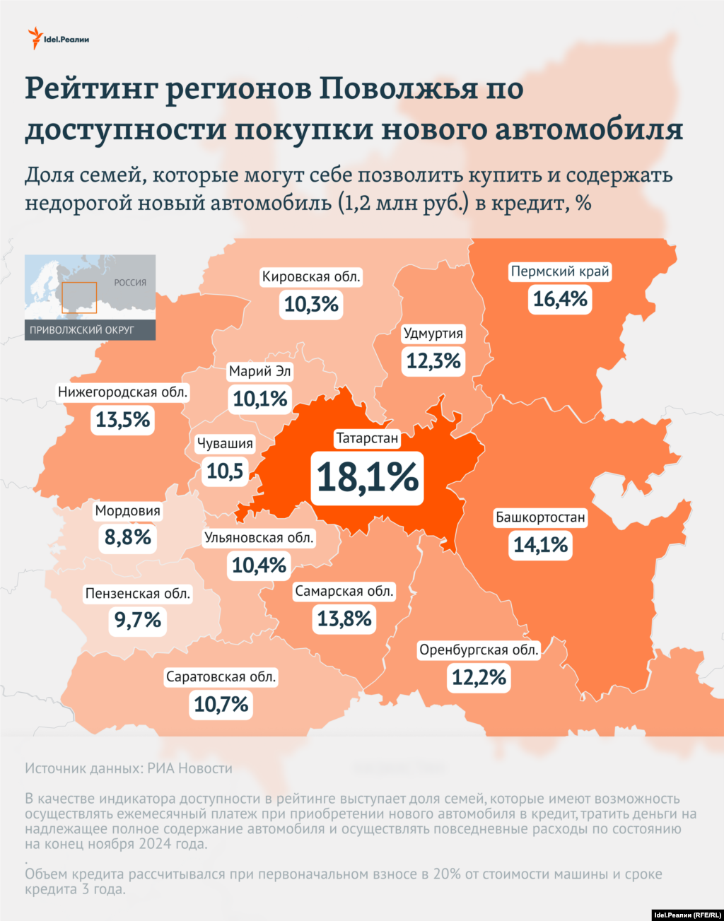 Согласно исследованию РИА Новости, в среднем в 2024 году в России доля семей, для которых доступна покупка в кредит и владение новым недорогим по сегодняшним меркам автомобилем (стоимостью 1,2 миллиона рублей), составила 17,6%. Как показали результаты рейтинга, доступность автомобиля для российских семей в текущем году снизилась главным образом из-за роста цен на автомобили и увеличения ставок кредитования.
